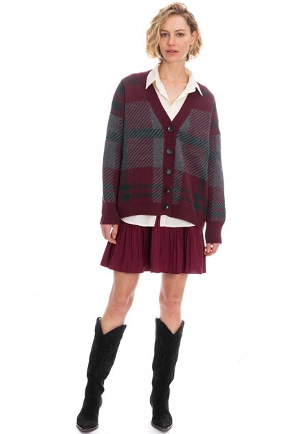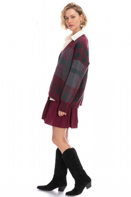 סריג מכופתר בגזרת אוברסייז בצבעים אפור, סגול וירוק.